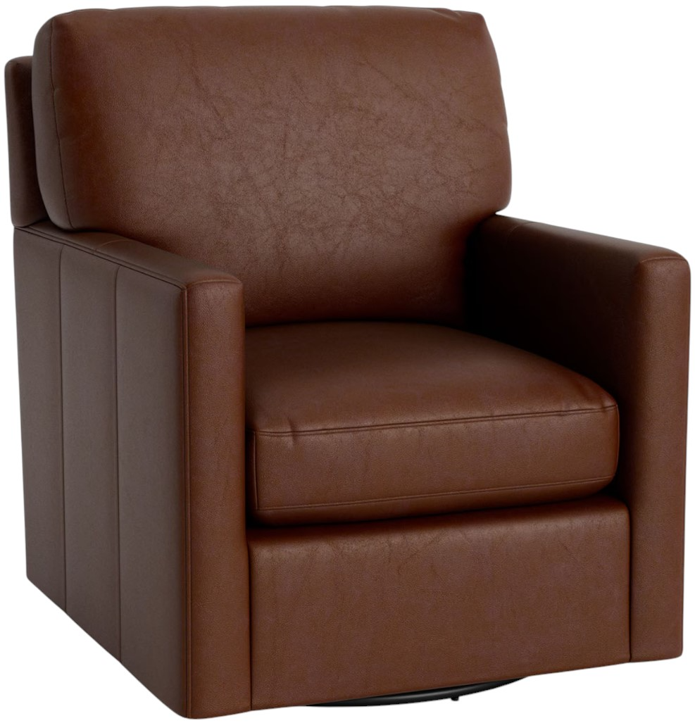 From living room to office to bedroom, there’s no more relaxing way to add modern seating to any nook, niche or gathering. The attached back and box-stitched seat cushions on the Trent keep you centered and comfortable at all times. You can choose from any of our fine Bassett leathers to further personalize your well-styled swiveling.
