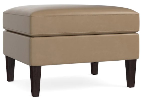 Webbed seating construction means you can comfortably settle your feet or a decorative tray, or even use it as a seat. A smooth, top-stitched top and tall, tapered wood legs in walnut finish give it a clean look. Choose your leather from a range of possibilities.