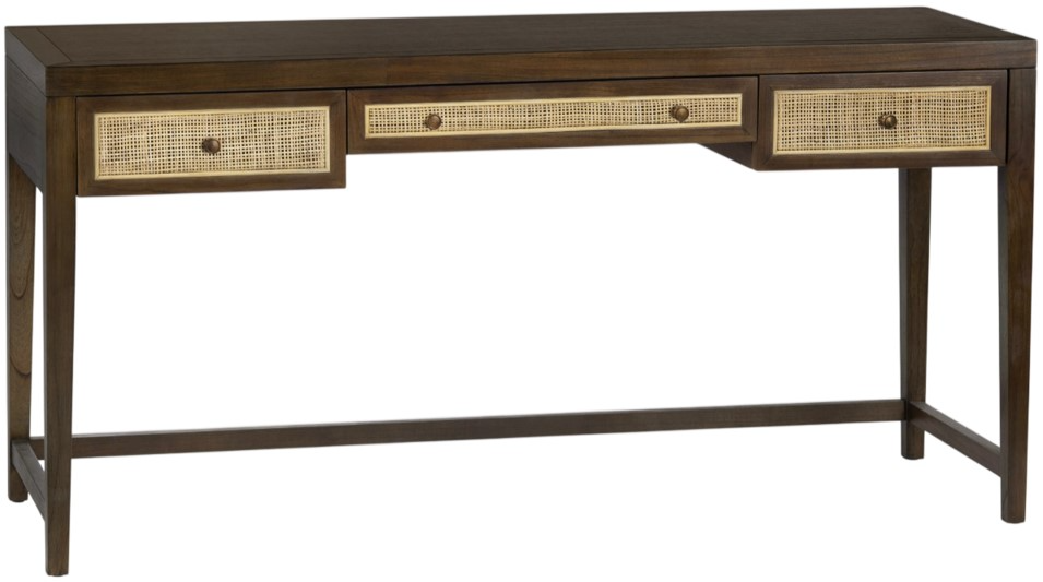 Plug into productivity with a hint of the tropics. A brown frame sets the stage for three drawers faced in hand-woven natural cane, giving modern edge and organic warmth at once. A full-depth center drawer hides keyboards or clutter while the open trestle base keeps your workspace light and leg-friendly.Read More