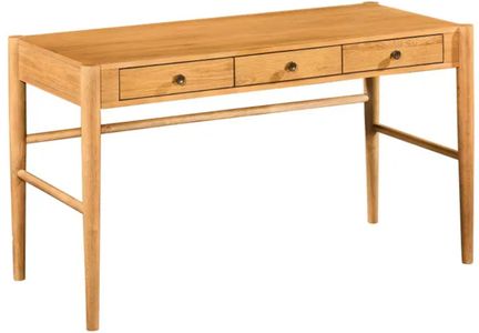 Rooted in timeless simplicity, this writing desk showcases clean lines and warm character. Made from wood with a natural tan grain and stained finish, it features a rectangular silhouette with three drawers and antique brass-finished knobs. Rounded, tapered legs and dowel stretchers lend a crafted touch.Read More