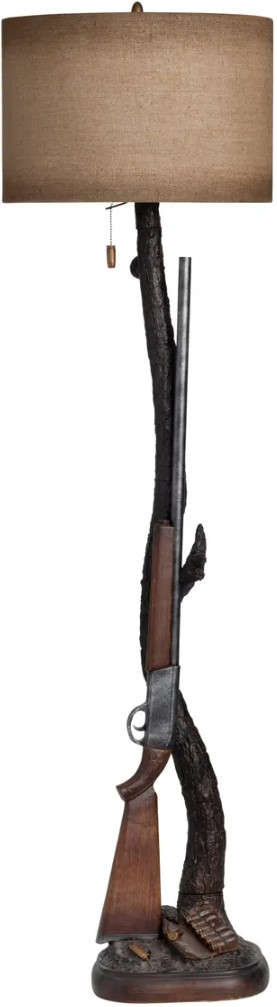 The Crestview Collection Hunt Floor Lamp is made with metal that has been given an aged look. The sculpted base features a rifle leaning up against the trunk of a tree. The shade has been finished to look like stretched leather and has browned edged on the top and bottom.Read More