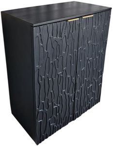 Designed with versatility in mind, this black wood bar cabinet offers a sculpted, modern look with subtle texture and refined detailing. Behind the carved doors, two fixed shelves provide space for bottles, glassware, or entertaining essentials. Brass-finished finger-ledge pulls, European hinges, and floor levelers complete this functional piece with quiet sophistication.Read More