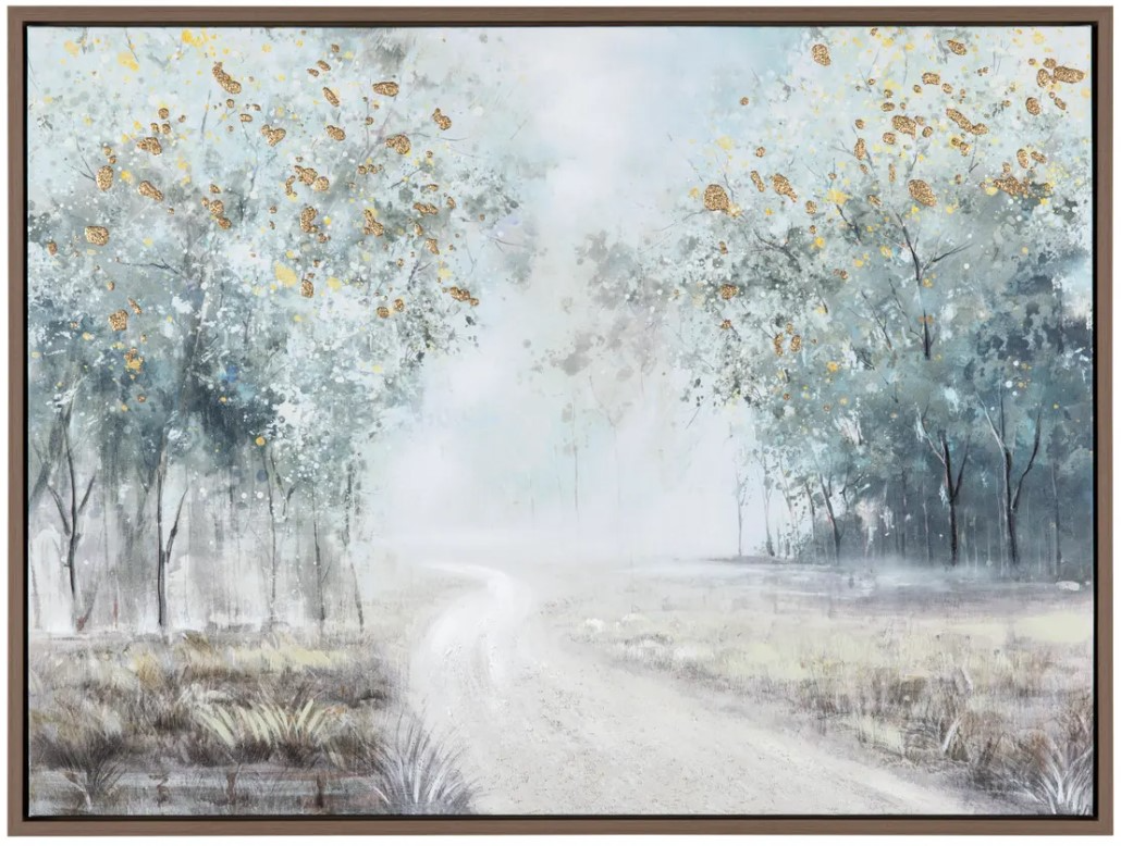 Take a walk in nature with The Crestview Collection "Teal Escape" Framed Canvas. Demonstrating a peaceful nature scene, this elegant hand-painted transitional style artwork features tones of teal, brown and green. Measuring 47.2-inches x 35.4-inches this charming painting offers a brown gallery frame that will perfectly accentuate your home or office.Read More