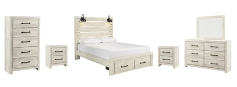 Includes panel bed with storage (headboard, footboard and rails), two 2-drawer nightstands, 5-drawer chest and 6-drawer dresser with mirror
