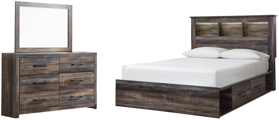 Includes queen bookcase bed (bookcase headboard, footboard, underbed storage unit, platform rails and wood roll slats) and 6-drawer dresser with mirror