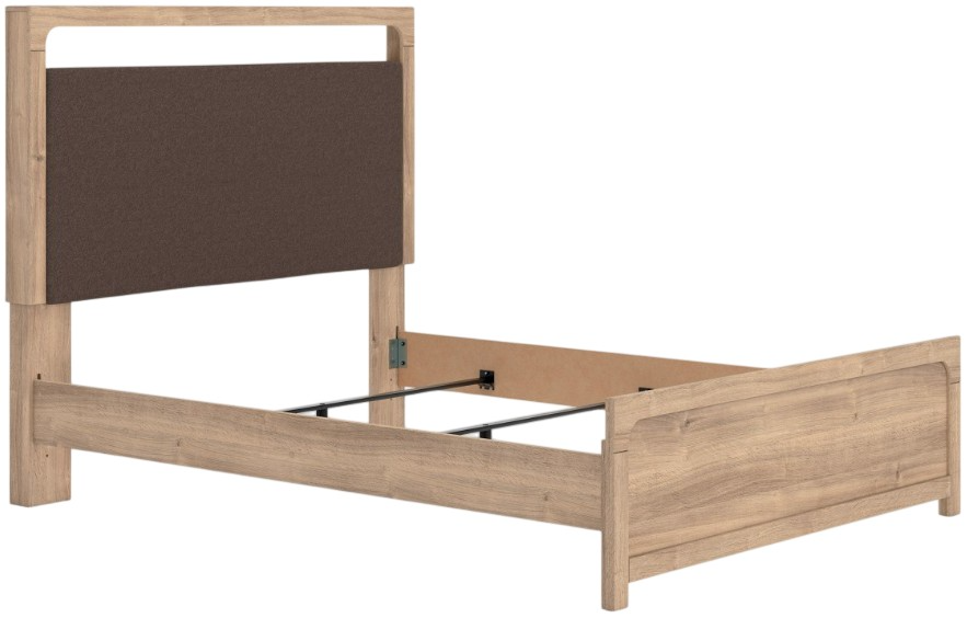 The natural wood tones and clean lines of this queen upholstered panel bed echo your easygoing style sensibilities. With a warm finish and replicated oak grain, its carefree character lightens up your bedroom. Curved inner corner details soften the look, while contrasting brown fabric modernizes the feel.Read More