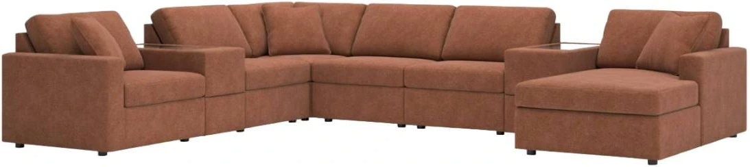 Includes 8 Modular Pieces: Left-arm facing corner chair, 3 armless chairs, 2 consoles with storage, wedge and right-arm facing corner chaise