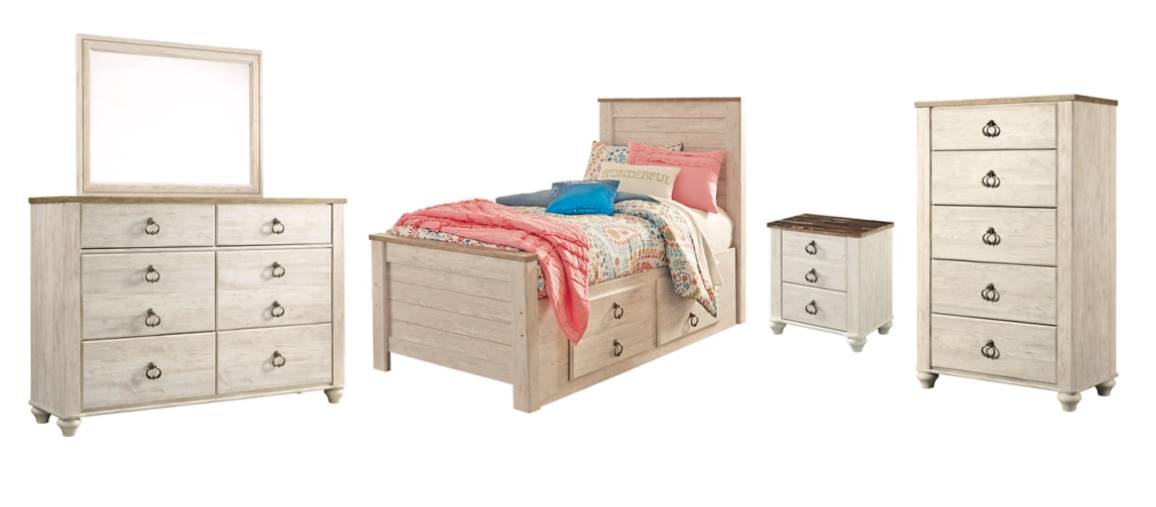 Includes twin panel bed with storage (headboard, footboard, rails, 2 storage drawers, roll slats), 6-drawer dresser with mirror, 5-drawer chest and 2-drawer nightstand