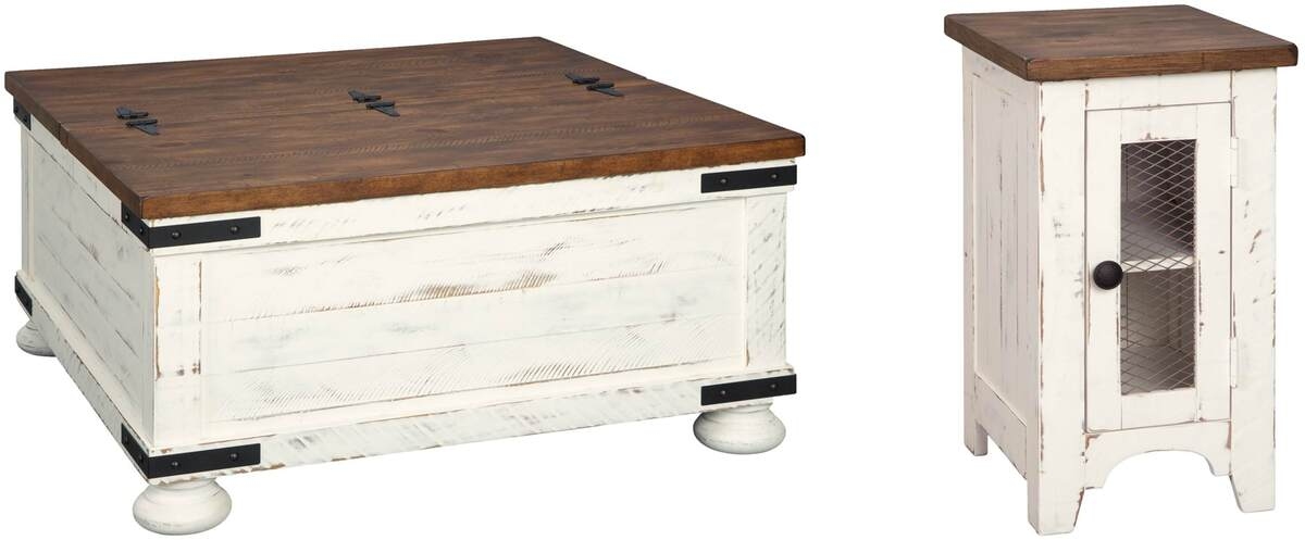 Double take. Sporting a two-tone finish that pairs a distressed vintage white with aged natural pine color, this occasional table set elevates the art of rustic farmhouse living. Enhancing its charm: a storage coffee table with two-sided lift and a cabinet/end table with classic inset metal grills.Read More